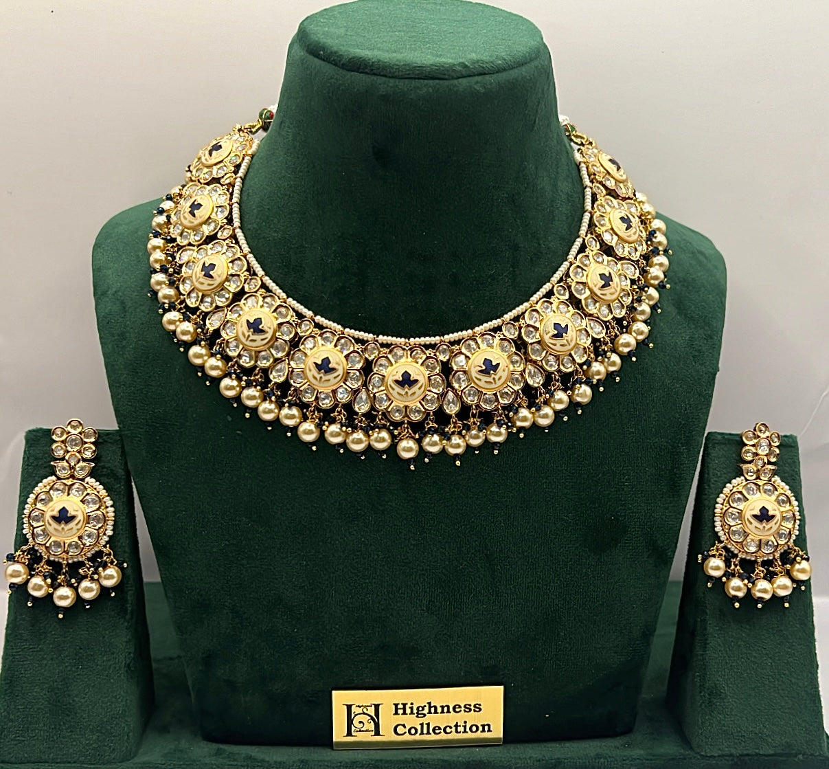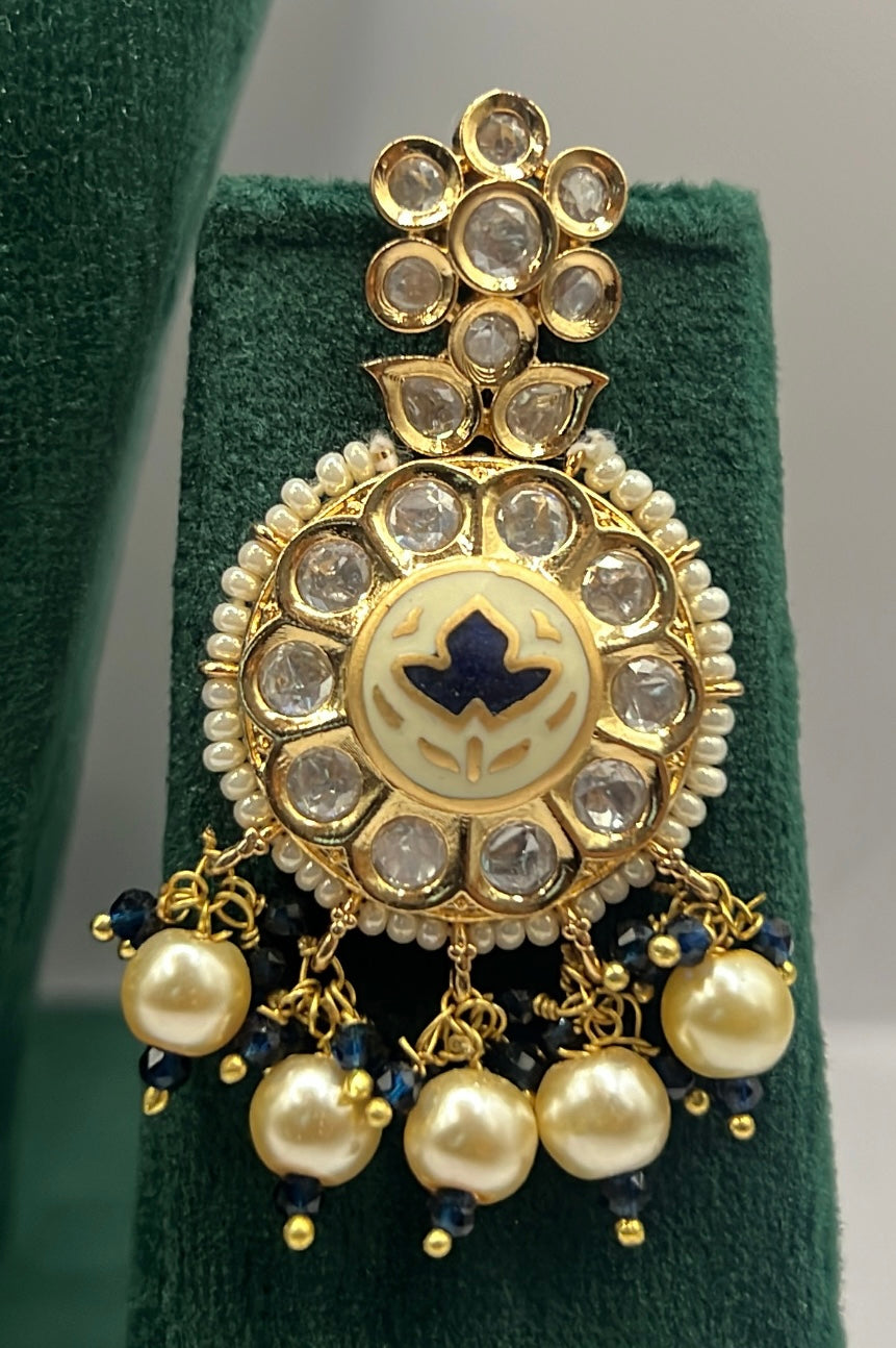 Expertly crafted and designed, our Meenakari Blue Necklace features intricate paachi kundan design set on a bold blue ivory backdrop. Delicately adorned with pearls, this necklace brings a touch of elegance to any outfit. Elevate your style with a timeless accessory that exudes both sophistication and charm.