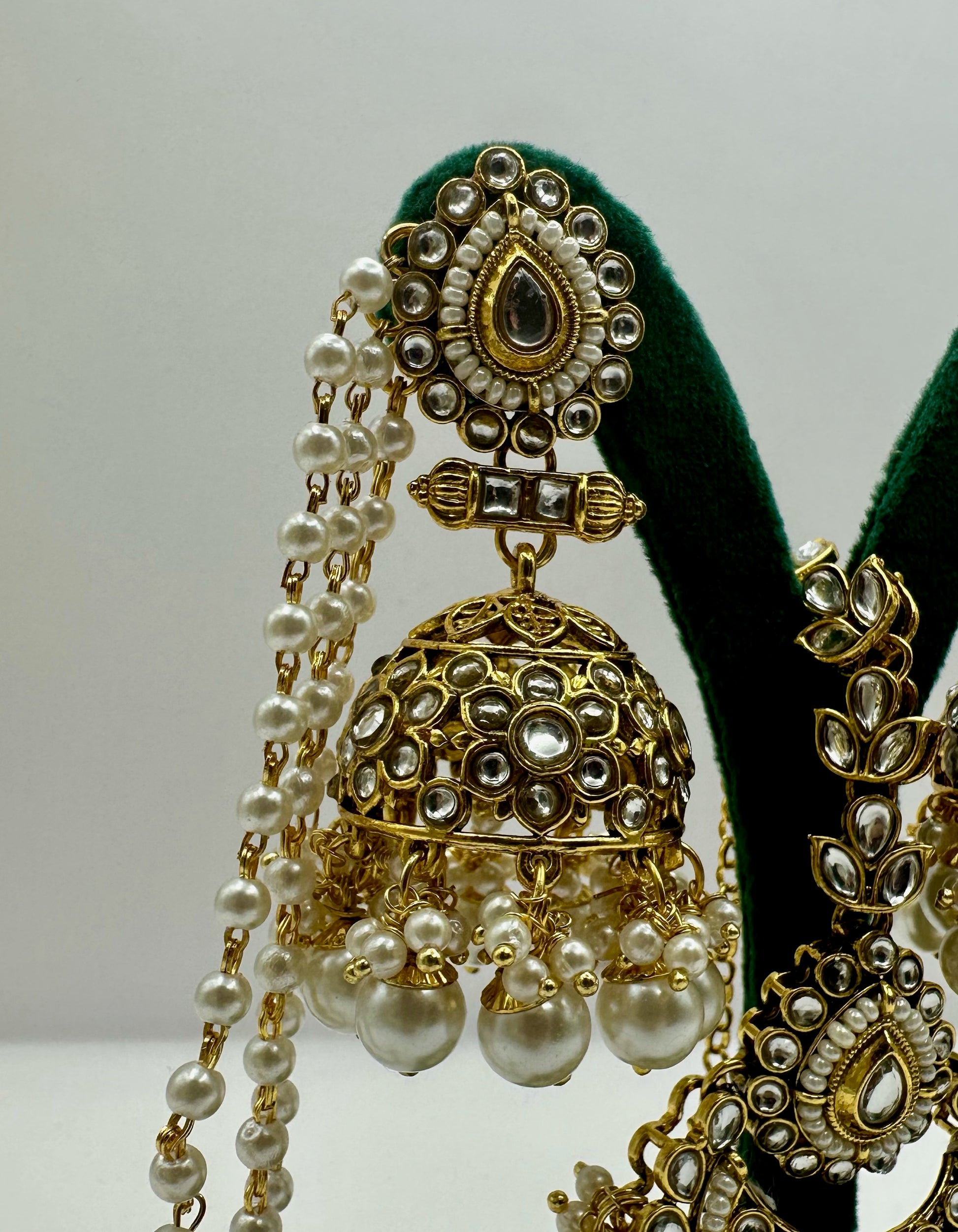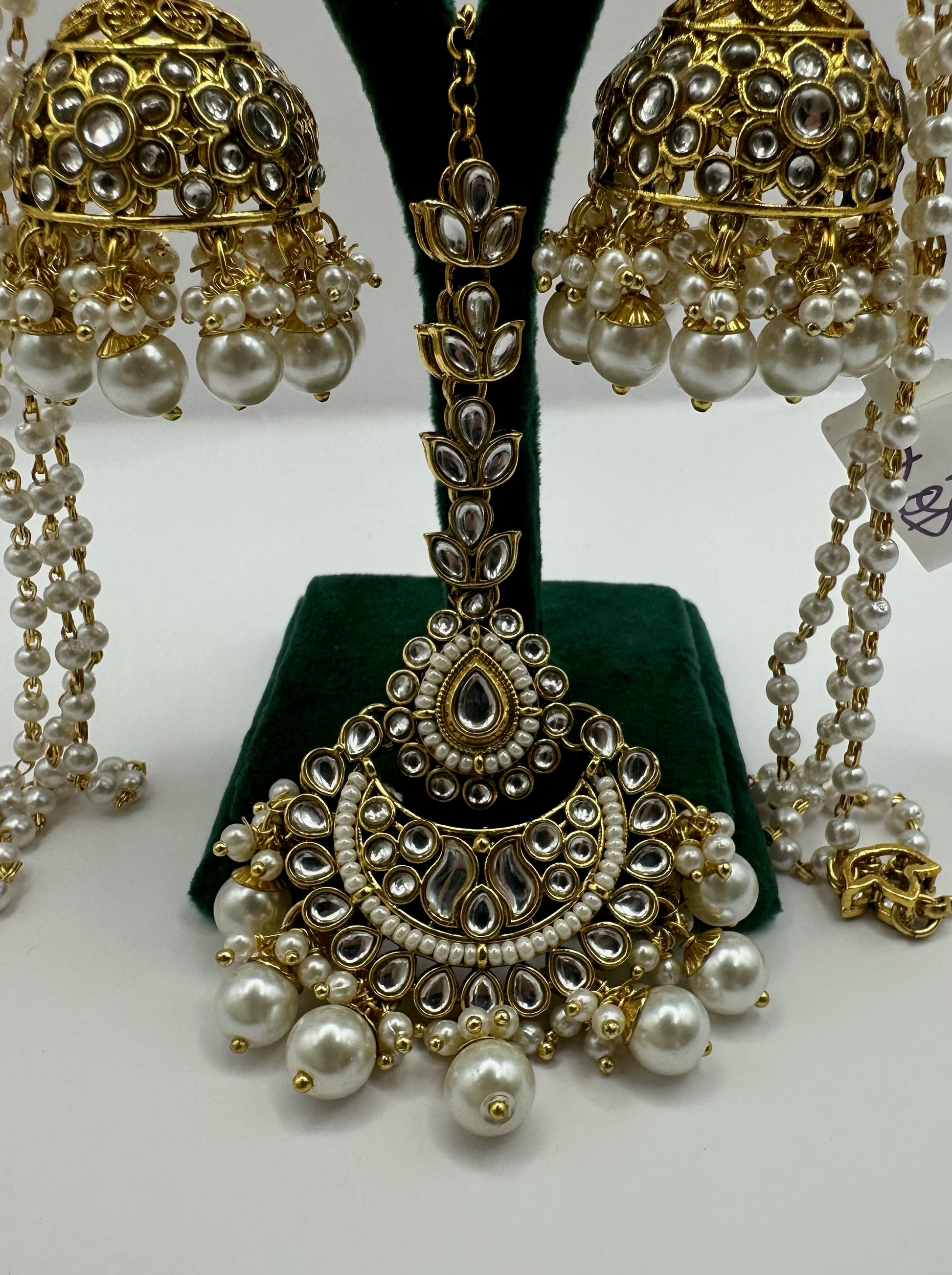 Enhance your look with our Polki Kundan Jhumkas and Tikka set. The teardrop shape adds a touch of elegance, while the sahara design creates a statement. Made with full gold, Clear stones, and pearls, this jewelry set exudes a regal feel. Complete your ensemble with this traditional and timeless set.