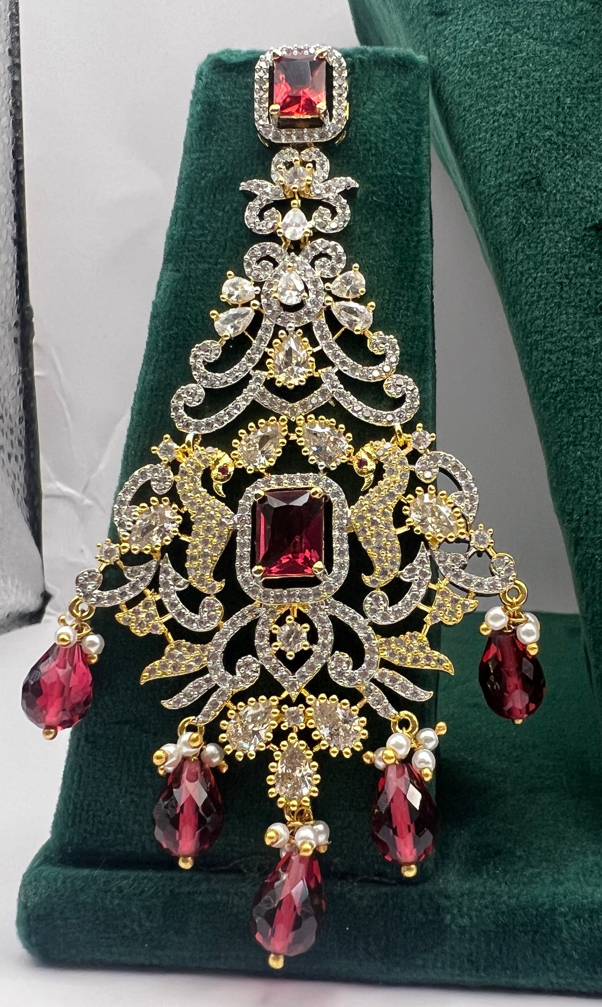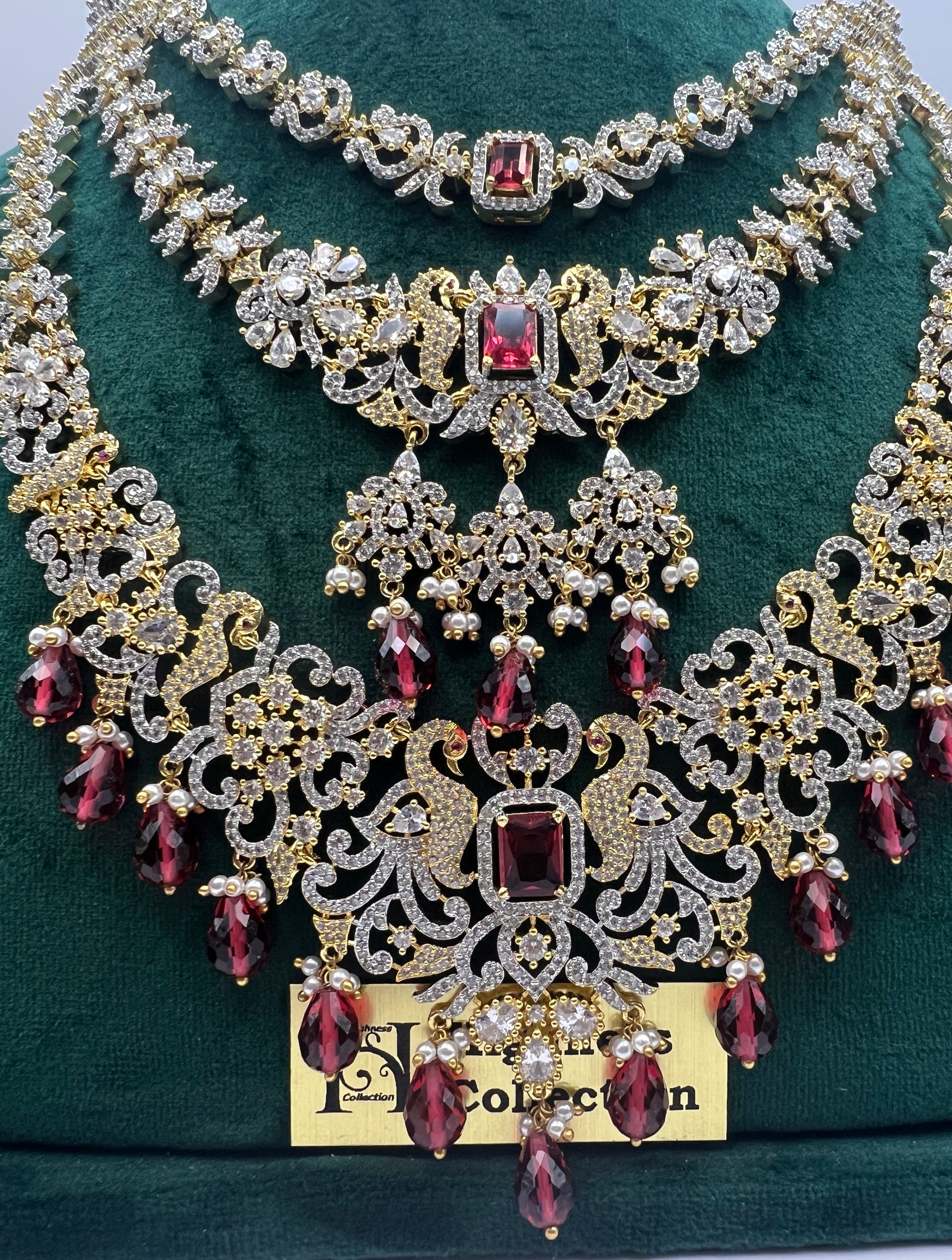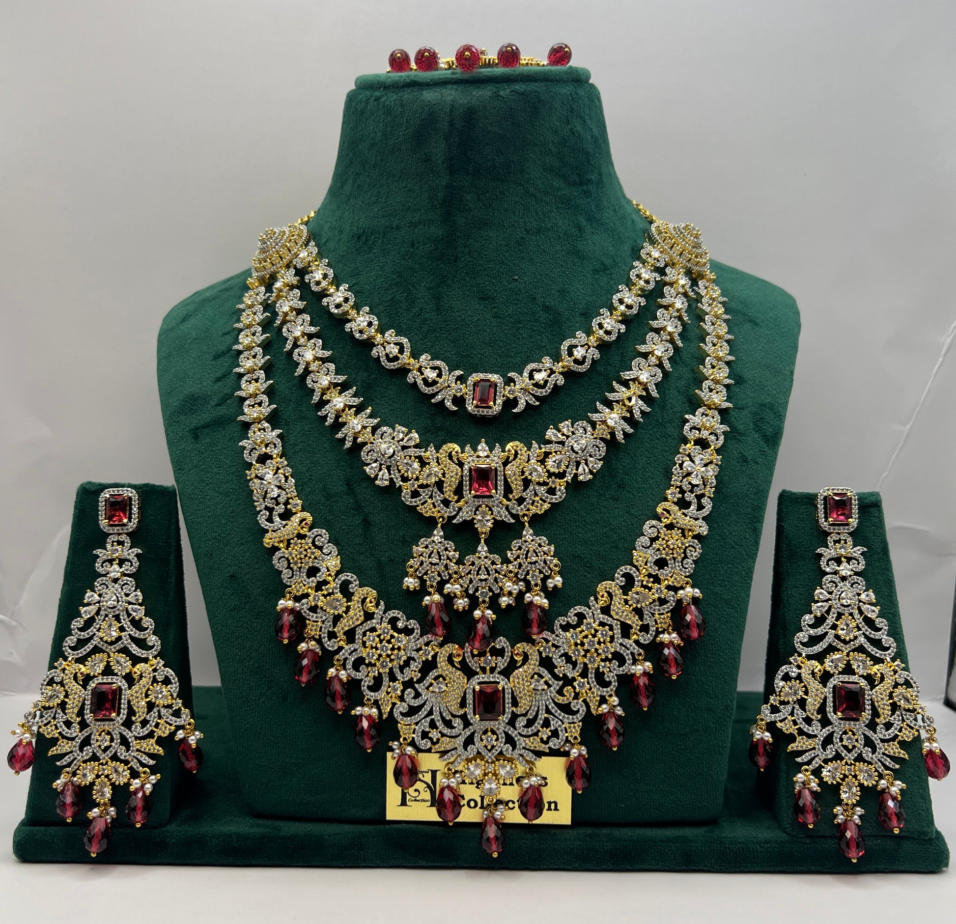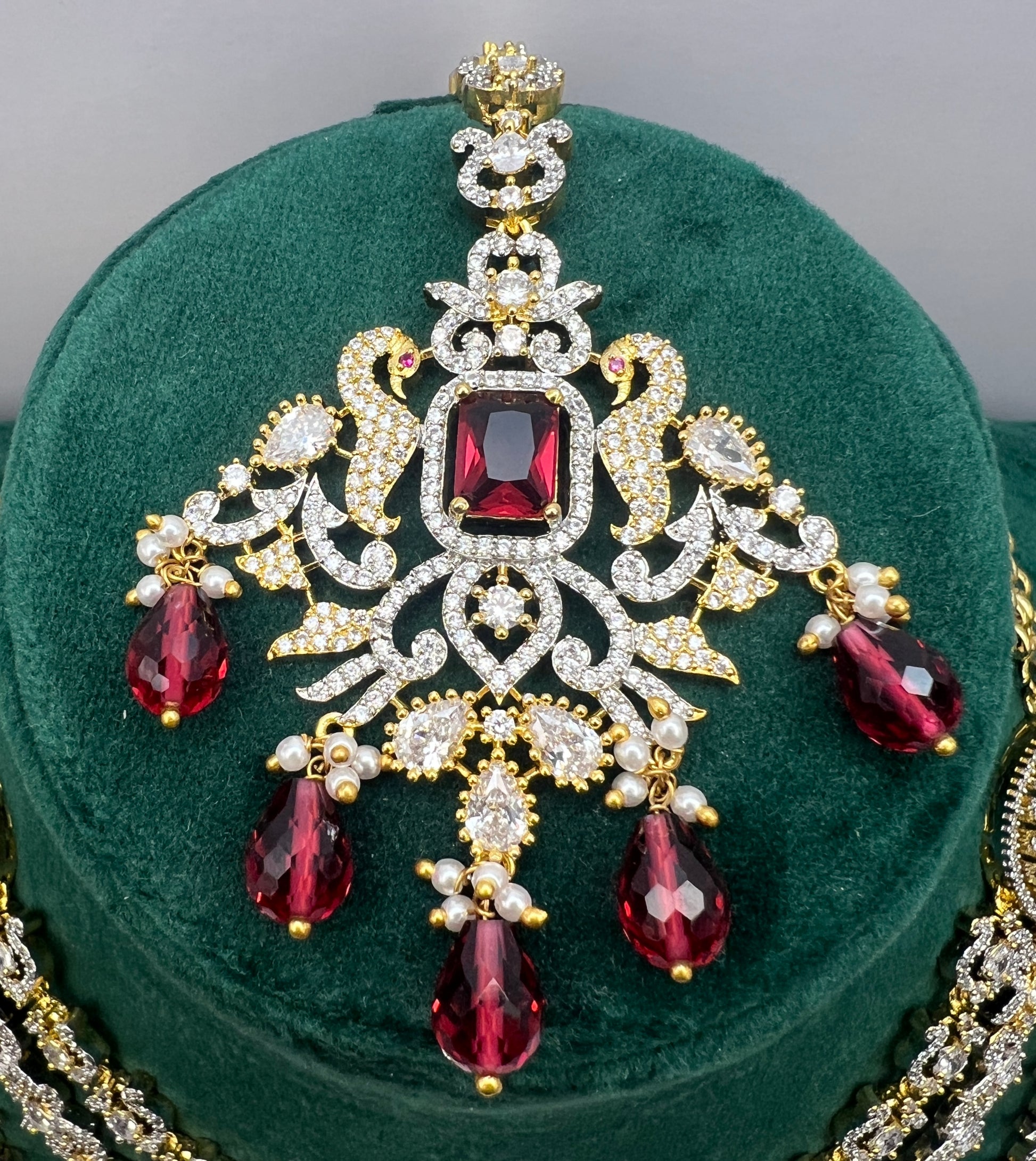 This elegant and unique Bridal Necklace features a 3-line layered design adorned with ruby stones and beads in two tones. The accompanying tikka and pearl-enhanced earrings complete the look, providing a stunning and luxurious accessory for any bridal ensemble. Elevate your wedding style with this beautiful necklace.