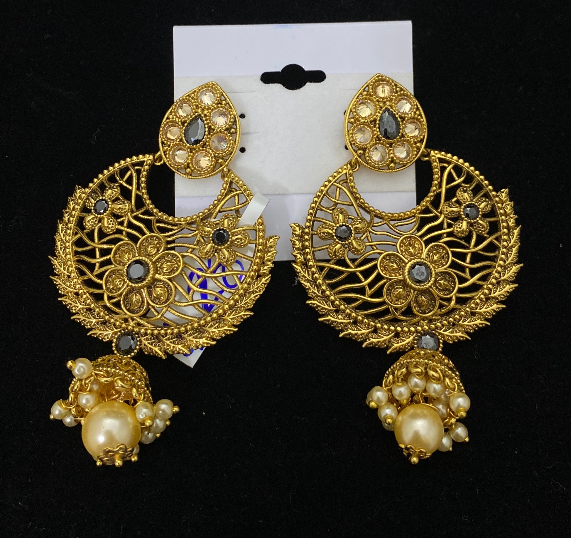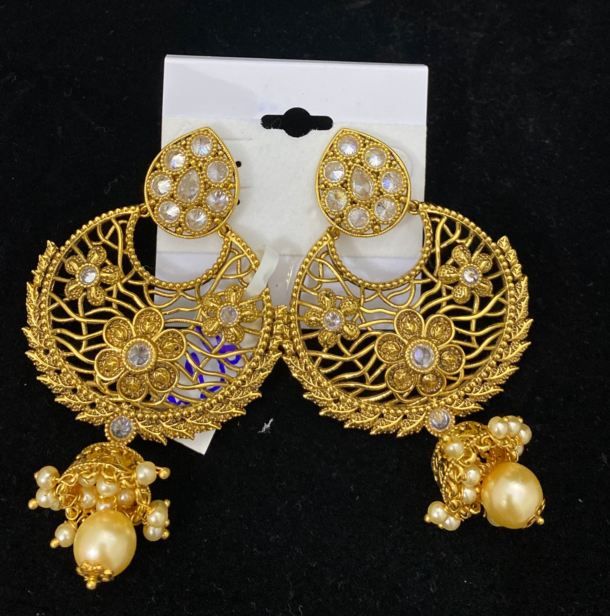 These Gold Polki Chandbali Jhumka Earrings feature a teardrop top embellished with pearls, giving them a classic, timeless look. Length: 3 inches