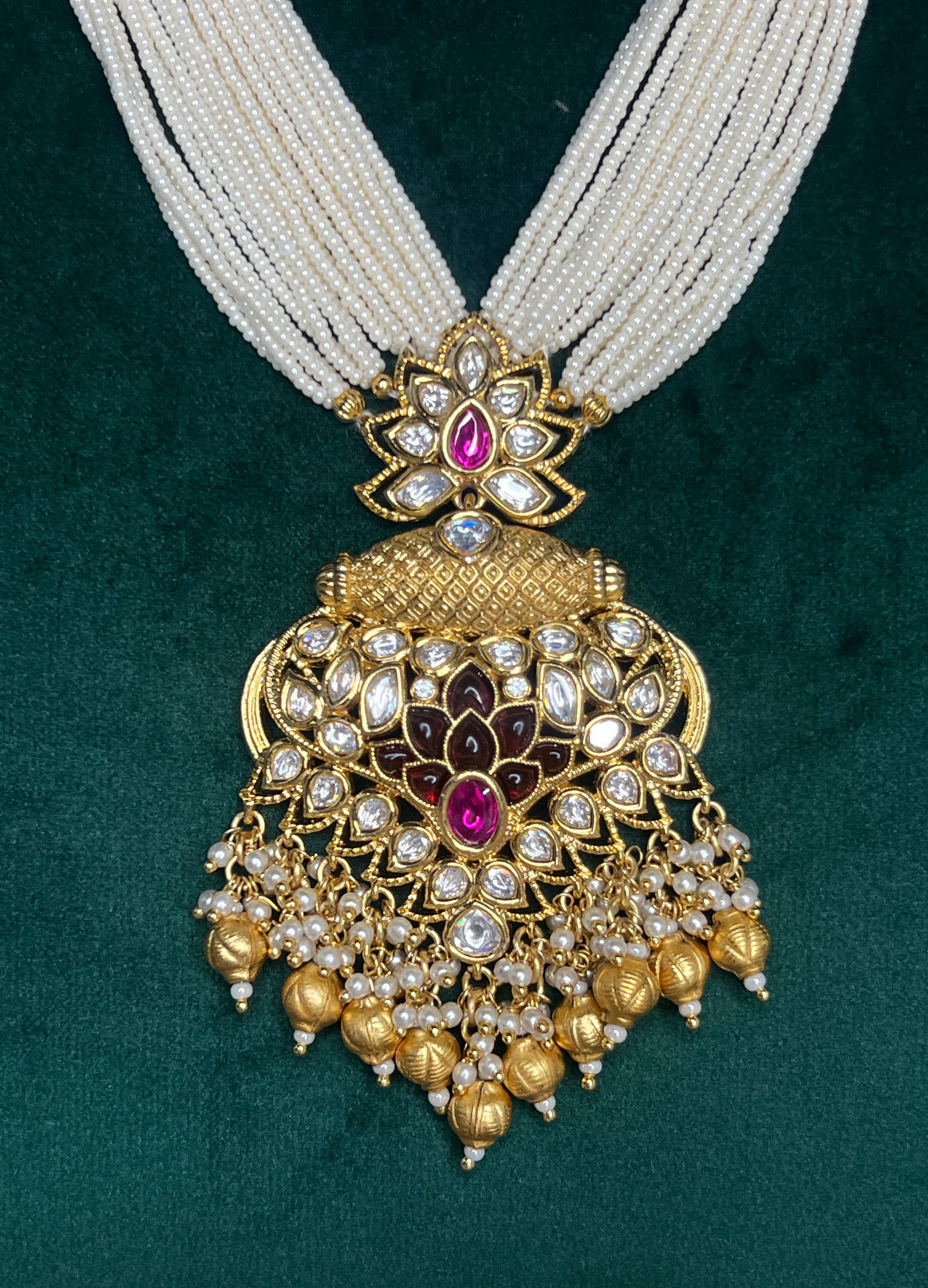 This Gold Ruby Pearl Mala is handcrafted with genuine pearls and beautiful ruby stones. The golden balls add a touch of elegance to the mala, while the pendant with tops makes it a versatile choice for any occasion. Enhance your spiritual practice with this stunning mala.