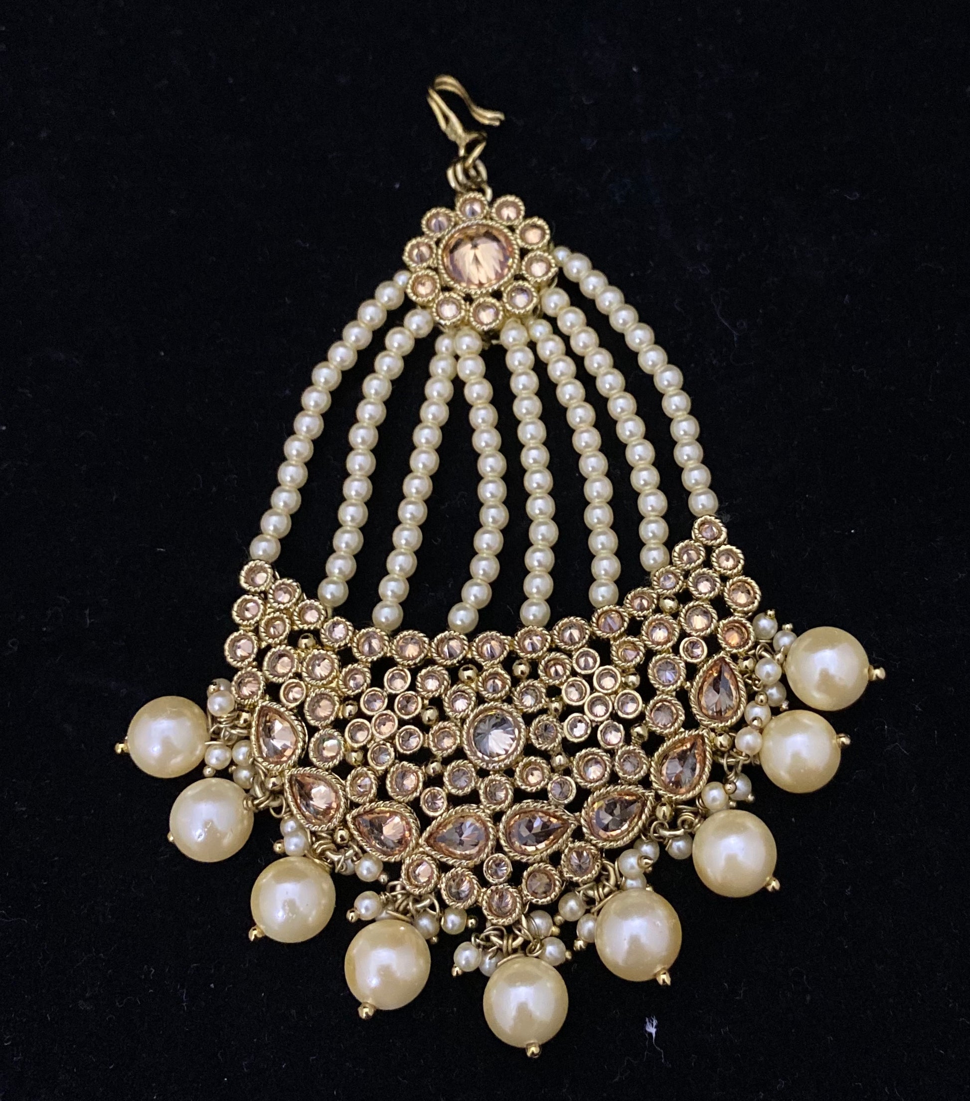 This Jhumar/Paasa is crafted in Copper with a beautiful Polki/Kundan stone adornment, contrasted with delicate Pearl lines and a hanging detail.