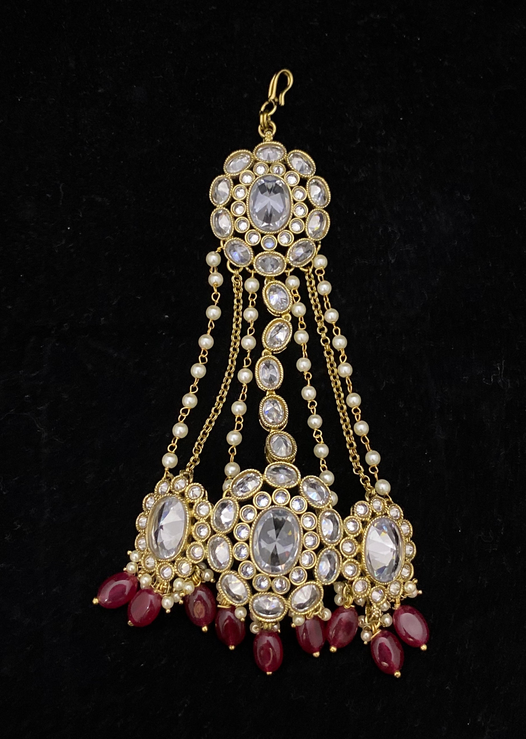 Polki Kundan Jhumar/Paasa crafted with White Stone Maroon Beads and Pearl accents. This intricate and eye-catching design is sure to be the perfect finishing touch for any special occasion.