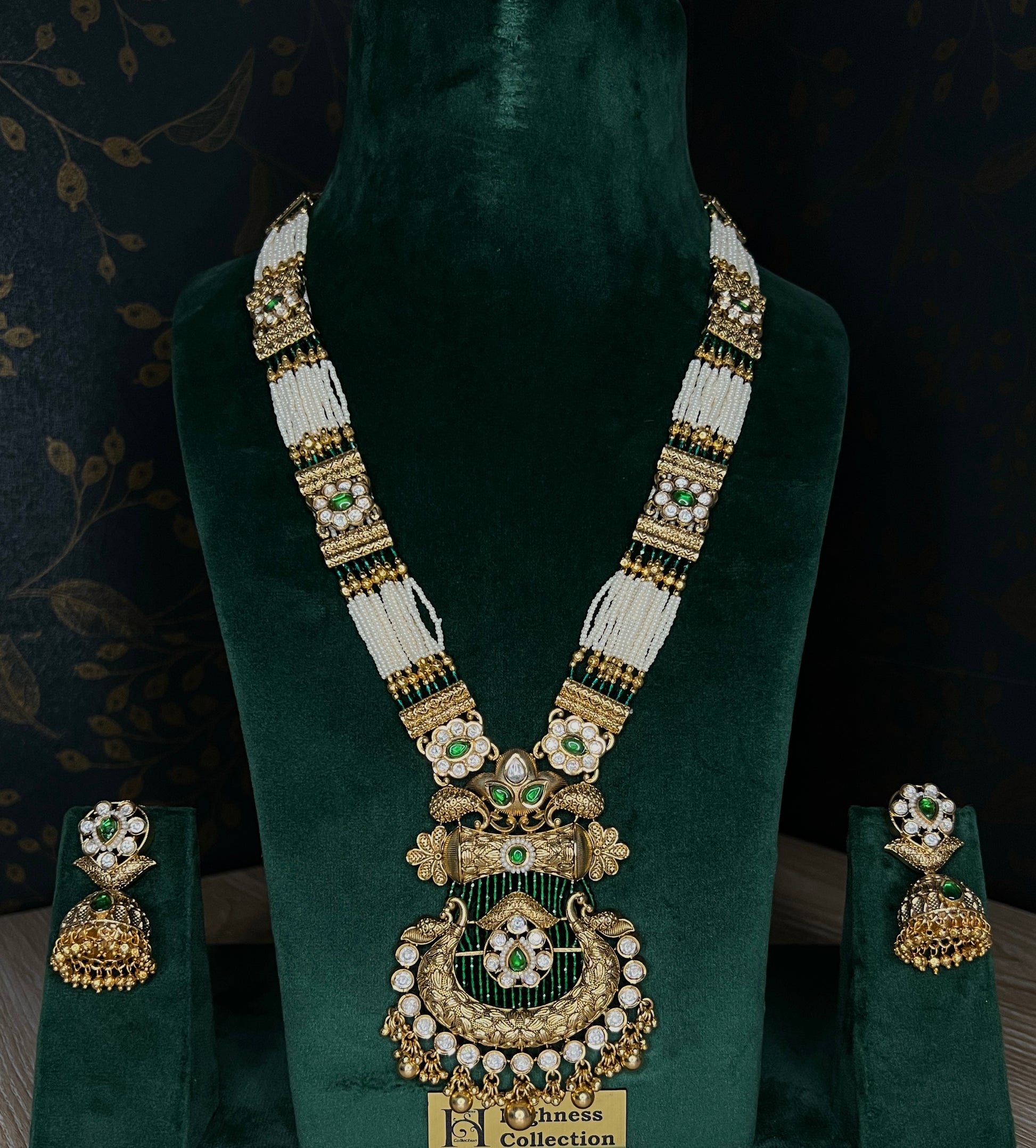 This Matte Kundan Long necklace is a stunning piece that combines traditional and modern elements. Adorned with pearls and green hydro beads, this necklace exudes elegance and sophistication. The jhumka detailing adds a touch of ethnic charm to the overall look. Perfect for any occasion, this necklace is a must-have for all jewelry lovers.