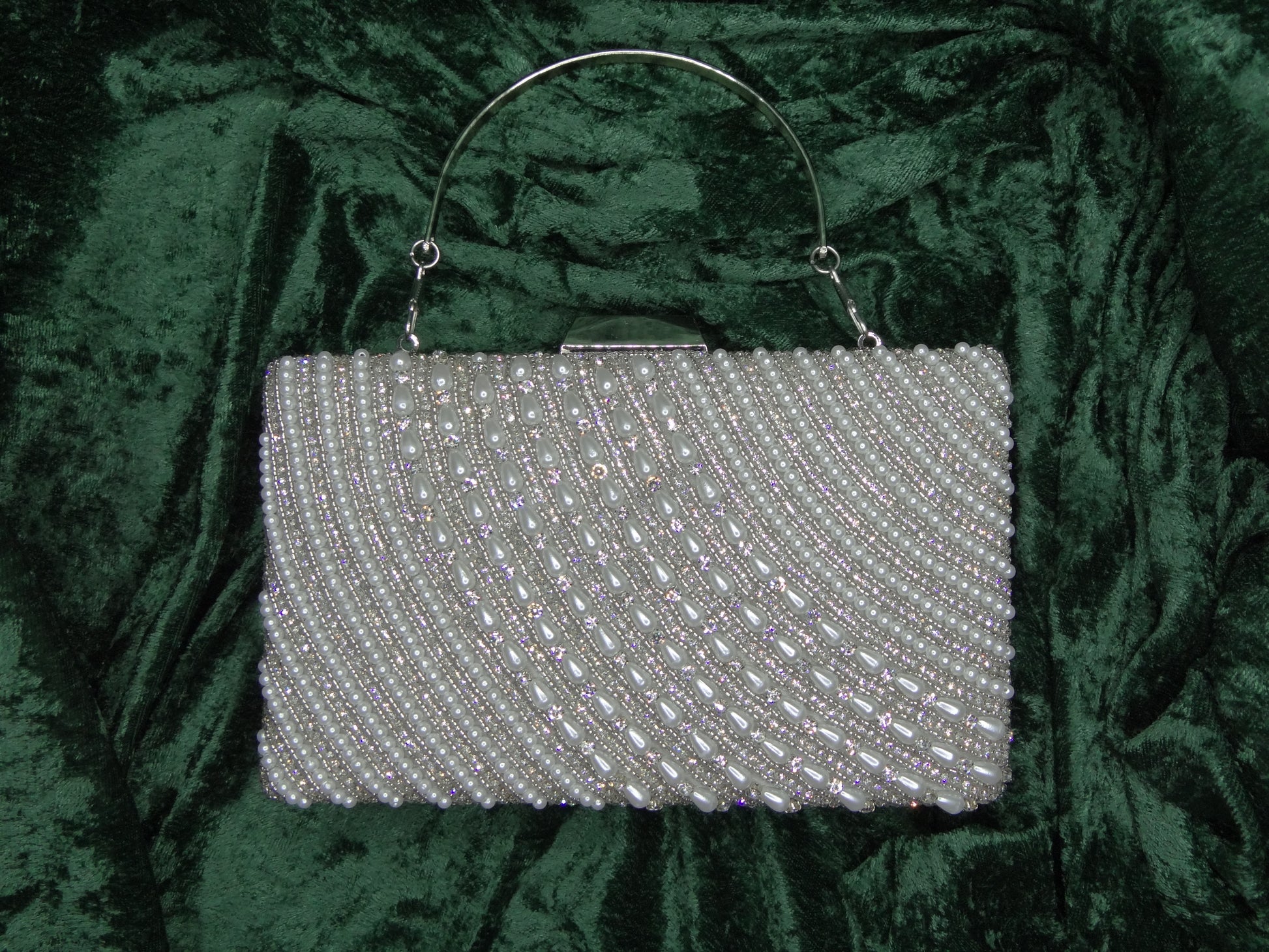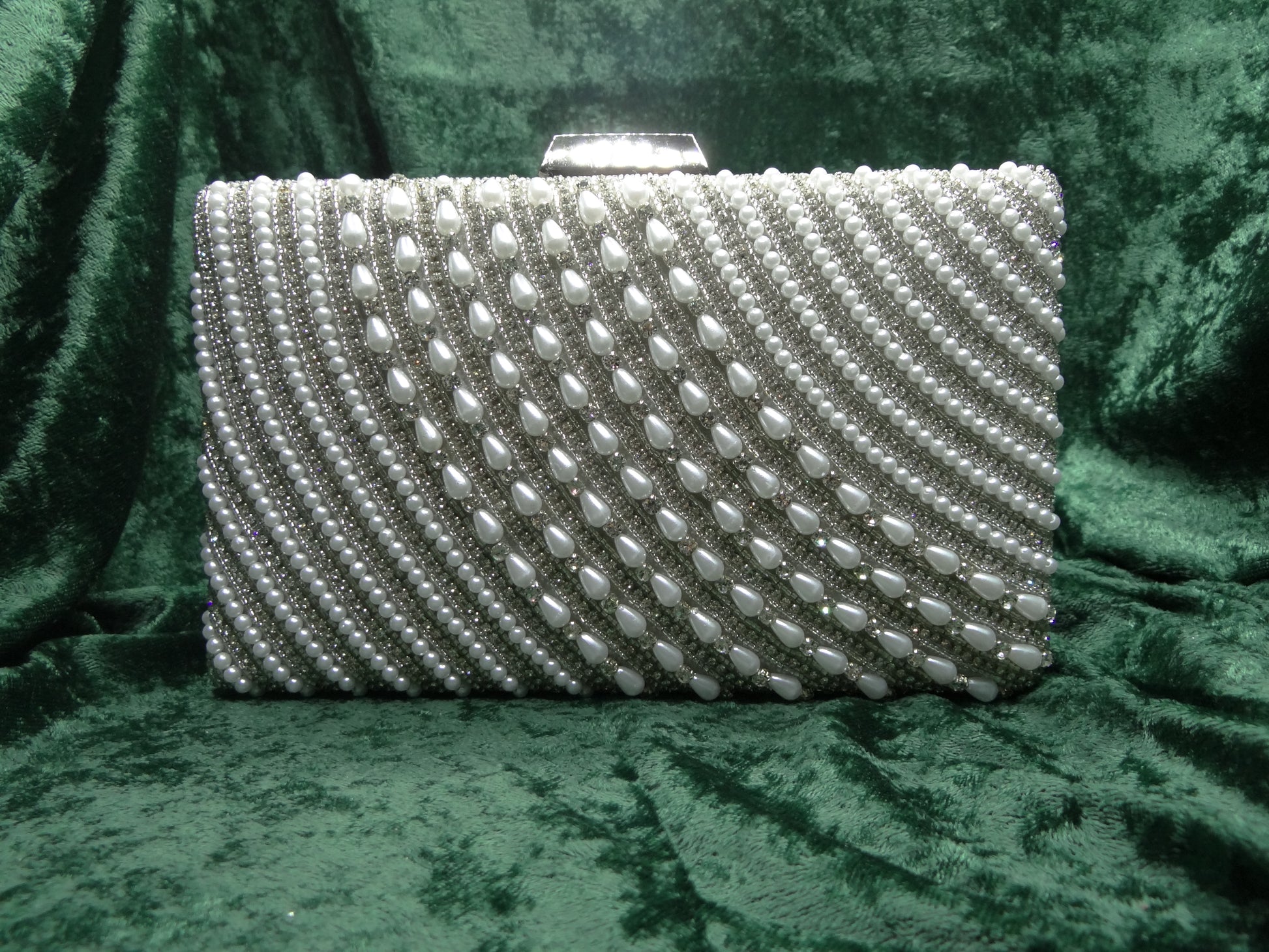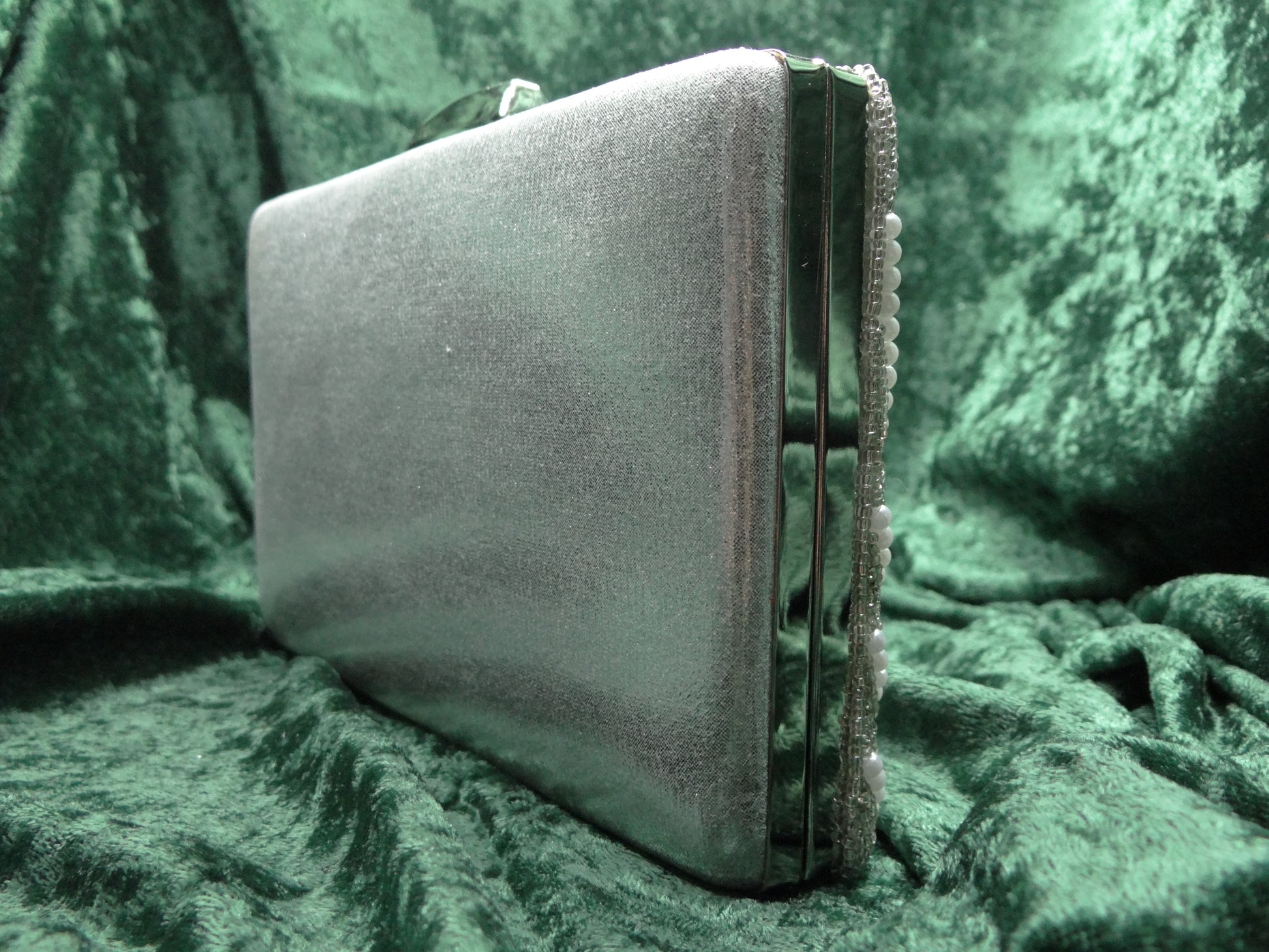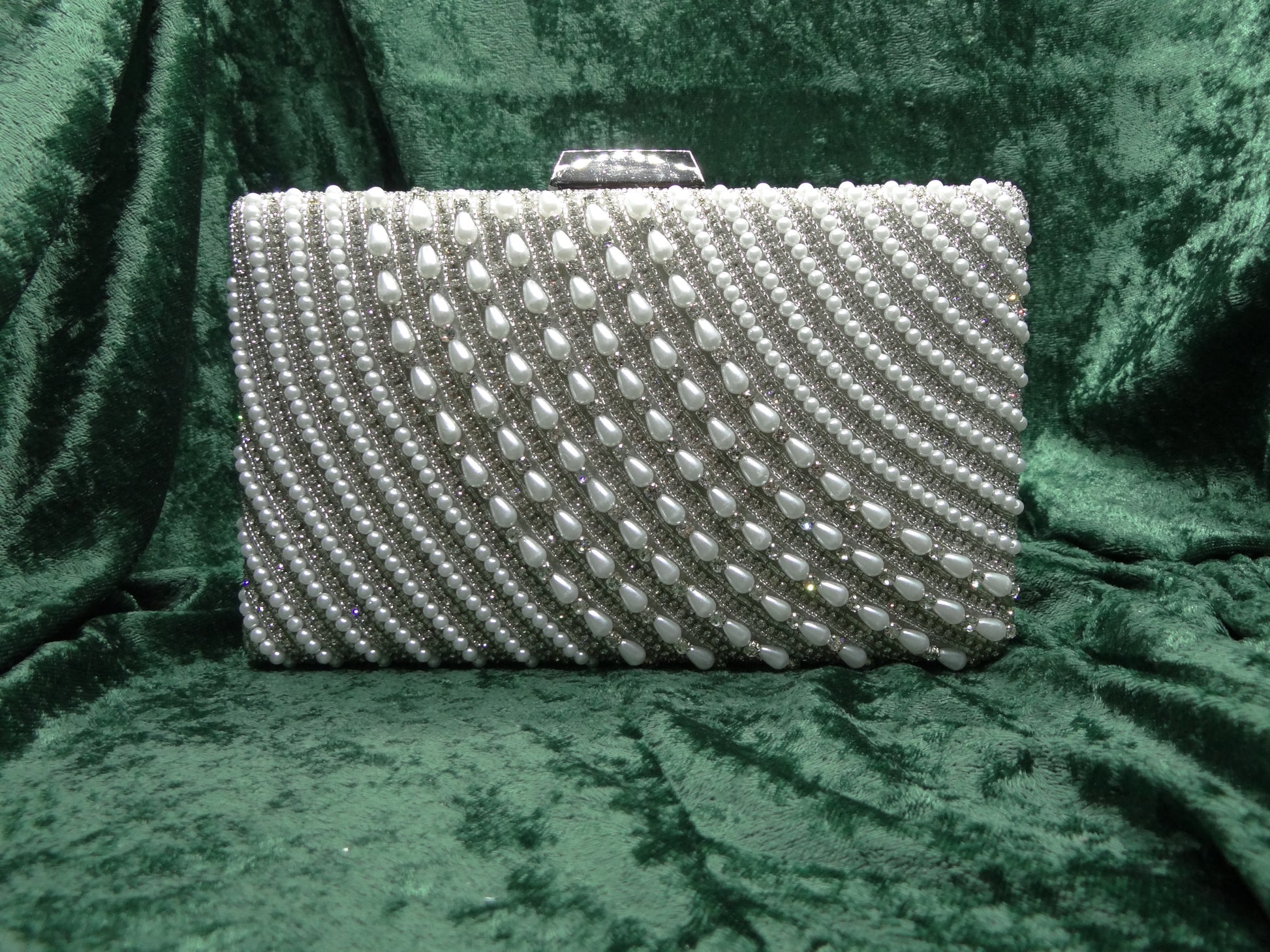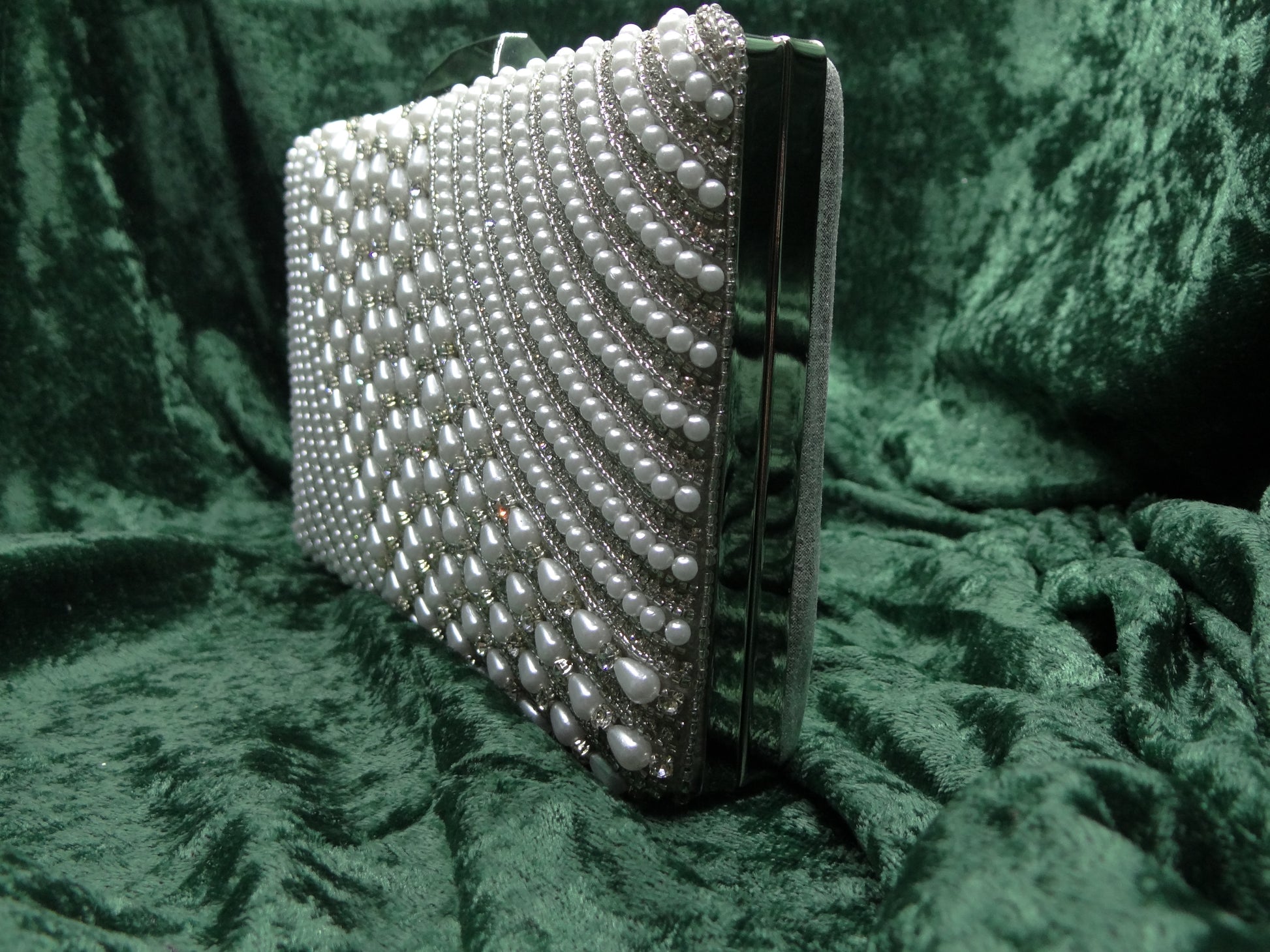 This elegant metal pearl purse features a stone-embellished fabric on one side, combining sophistication with subtle sparkle. Designed with a 7.5-inch length, 1.25-inch width, and 4.7-inch height, it comfortably fits essentials like a phone and keys. The included shoulder chain adds versatility, allowing for hands-free convenience while maintaining a refined look. Ideal for both formal occasions and stylish everyday use.