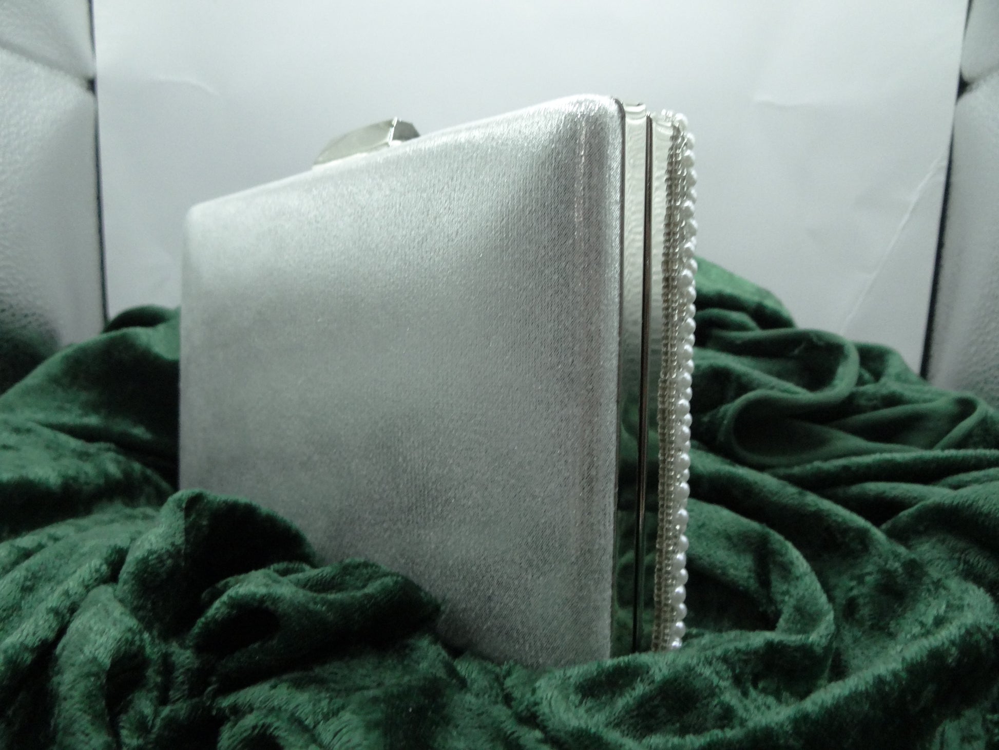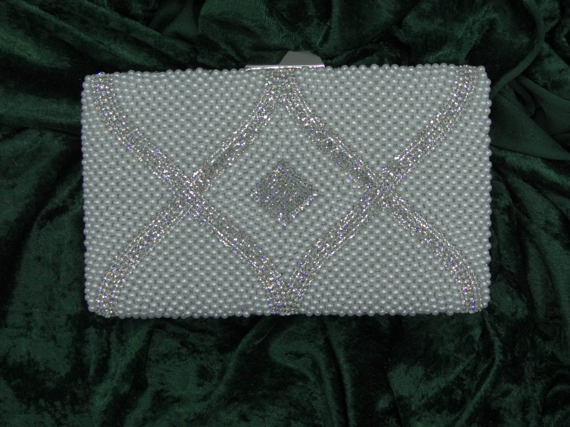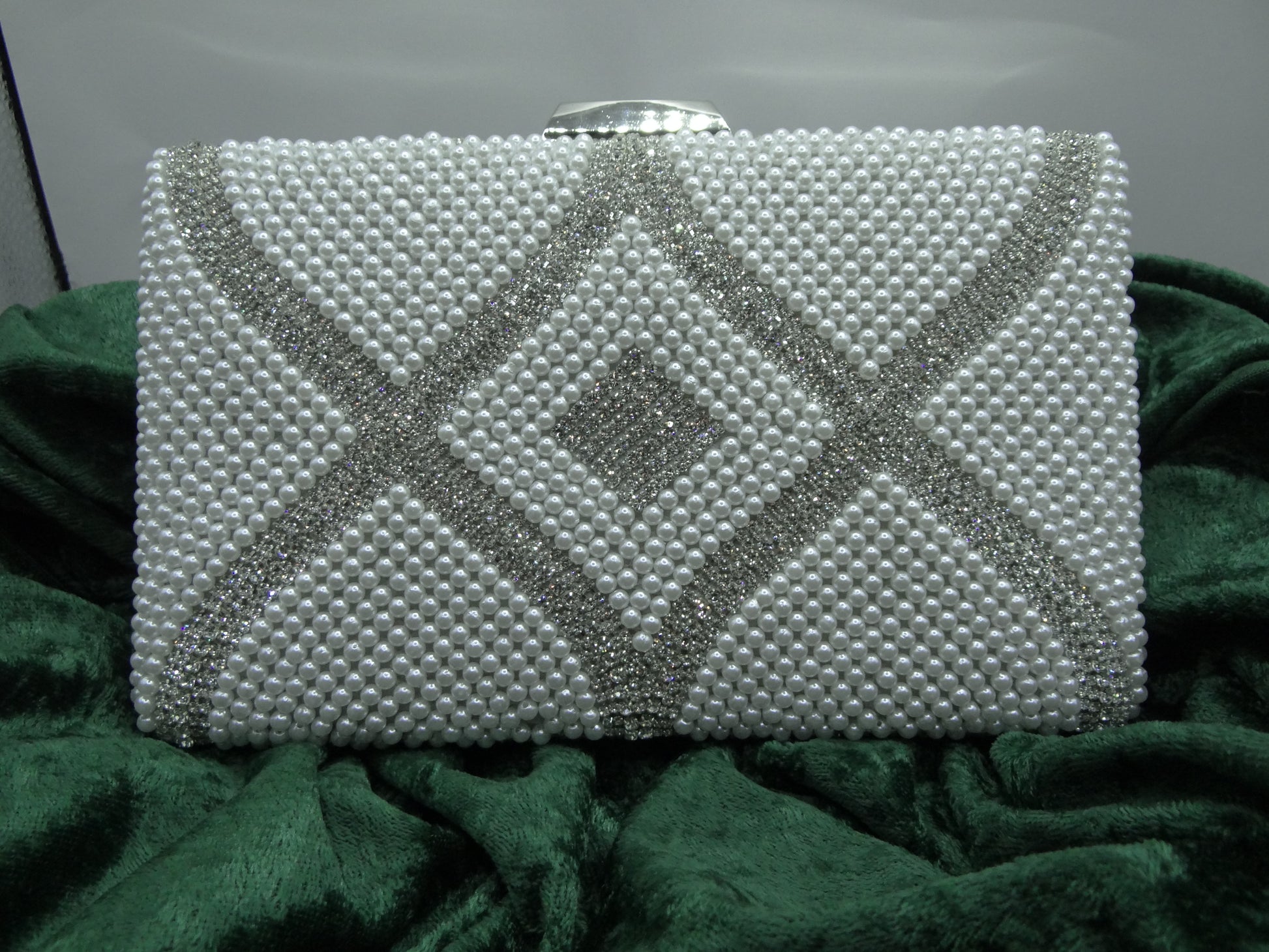 The Pearl Evening Clutch is an elegant accessory featuring a classic design adorned with pearl stones. Measuring approximately 8 inches in length, 5 inches in height, and 1.15 inches in width, it offers a compact yet stylish option for evening events. Equipped with a metal frame and a chain strap, it can be carried by hand or worn over the shoulder for versatile use. This clutch combines timeless sophistication with practical functionality, making it an ideal choice for formal occasions.