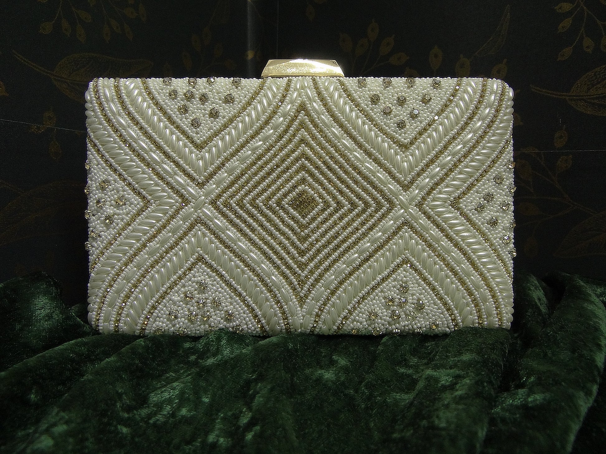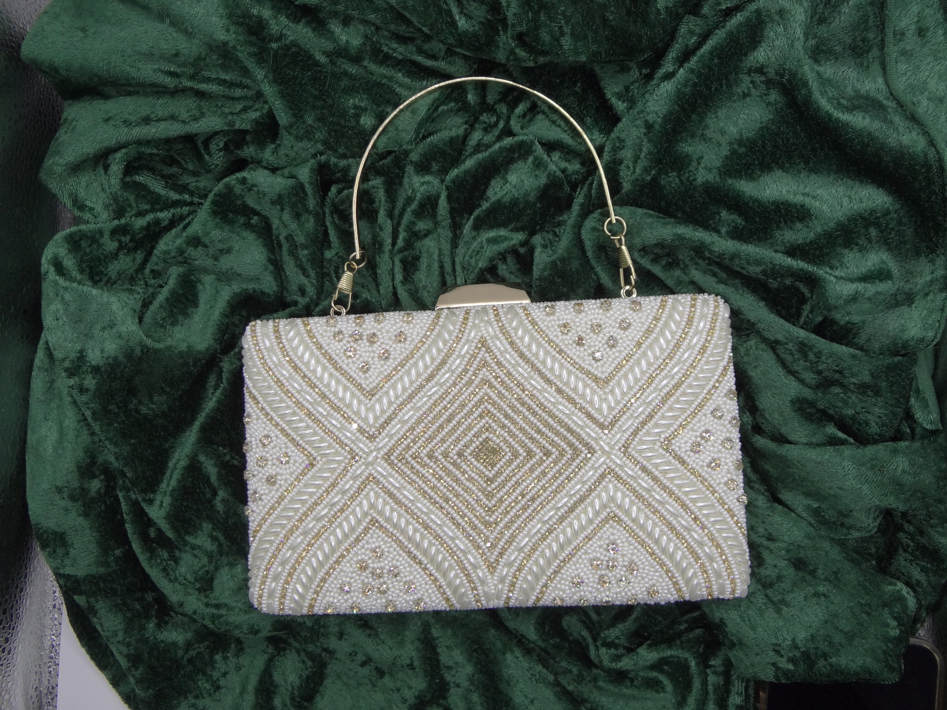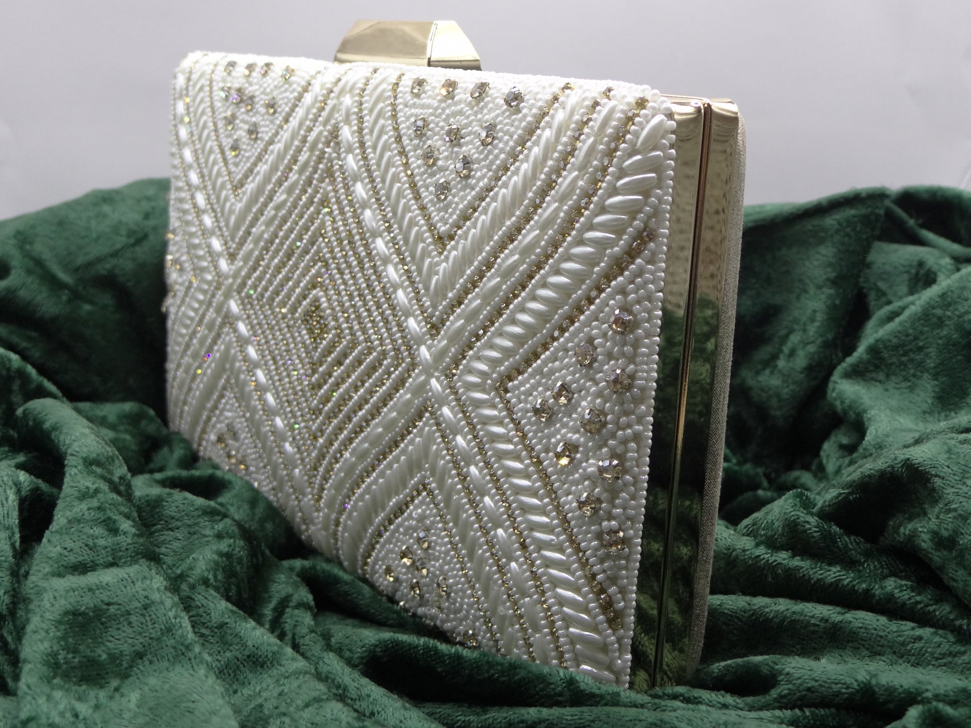 The Pearl Evening Clutch is an elegant accessory featuring a classic design adorned with pearl stones. Measuring approximately 8 inches in length, 5 inches in height, and 1.15 inches in width, it offers a compact yet stylish option for evening events. Equipped with a metal frame and a chain strap, it can be carried by hand or worn over the shoulder for versatile use. This clutch combines timeless sophistication with practical functionality, making it an ideal choice for formal occasions.