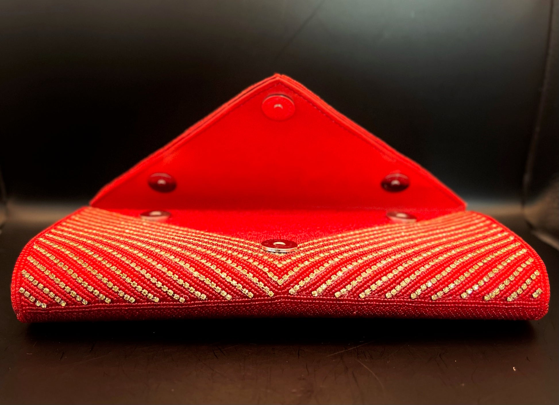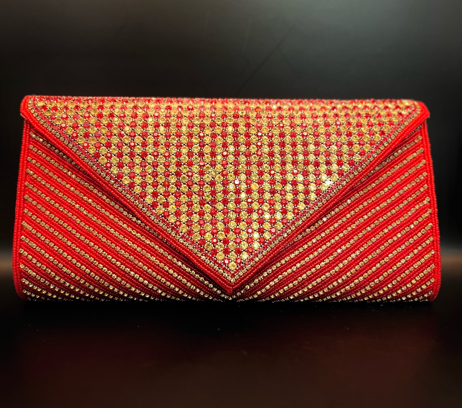 This red and gold purse is crafted with beads and stones, making it resilient and spacious. It features a handle for easy transport.