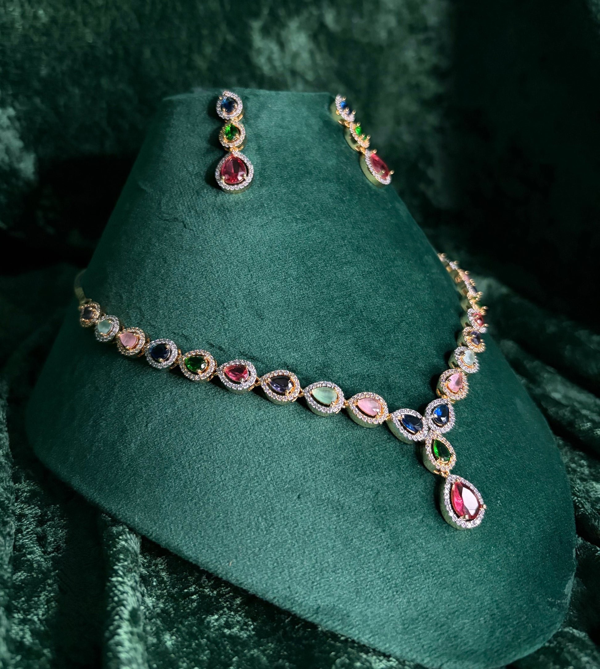# Multi Navratan Necklace Celebrate the timeless elegance of traditional craftsmanship with this exquisite Multi Navratan Necklace. Featuring nine precious and semi-precious gemstones—each representing distinct astrological significance—this delicate piece combines cultural heritage with refined sophistication. The carefully selected ad stones are set with precision, creating a harmonious blend of vibrant hues that catch light beautifully. Perfect for special occasions or as a meaningful addition to your everyday collection, this necklace embodies both spiritual symbolism and wearable artistry. An investment in authentic jewelry that transcends trends.