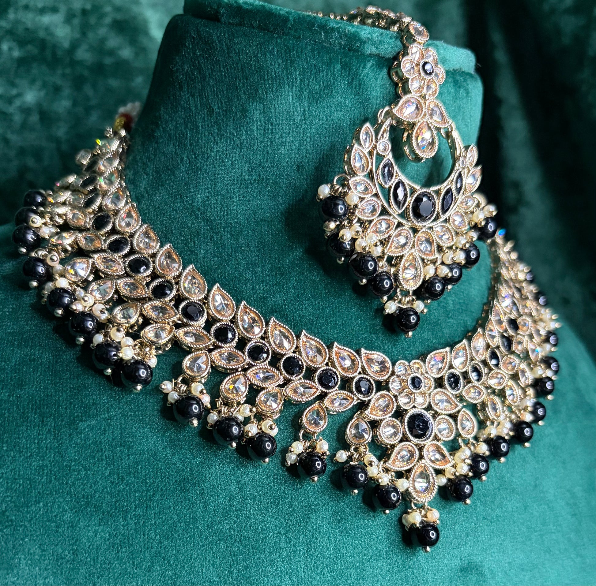 This exquisite Black Polki necklace showcases traditional craftsmanship with lustrous black beads and authentic Polki stones set in an elegant design. The adjustable dori (thread) closure ensures a comfortable, customizable fit for any neckline. This comprehensive set includes a matching tikka and earrings, offering a coordinated jewelry ensemble perfect for special occasions, weddings, or festive celebrations. Polki's timeless appeal and the striking contrast of black stones make this piece a sophisticated addition to any jewelry collection.