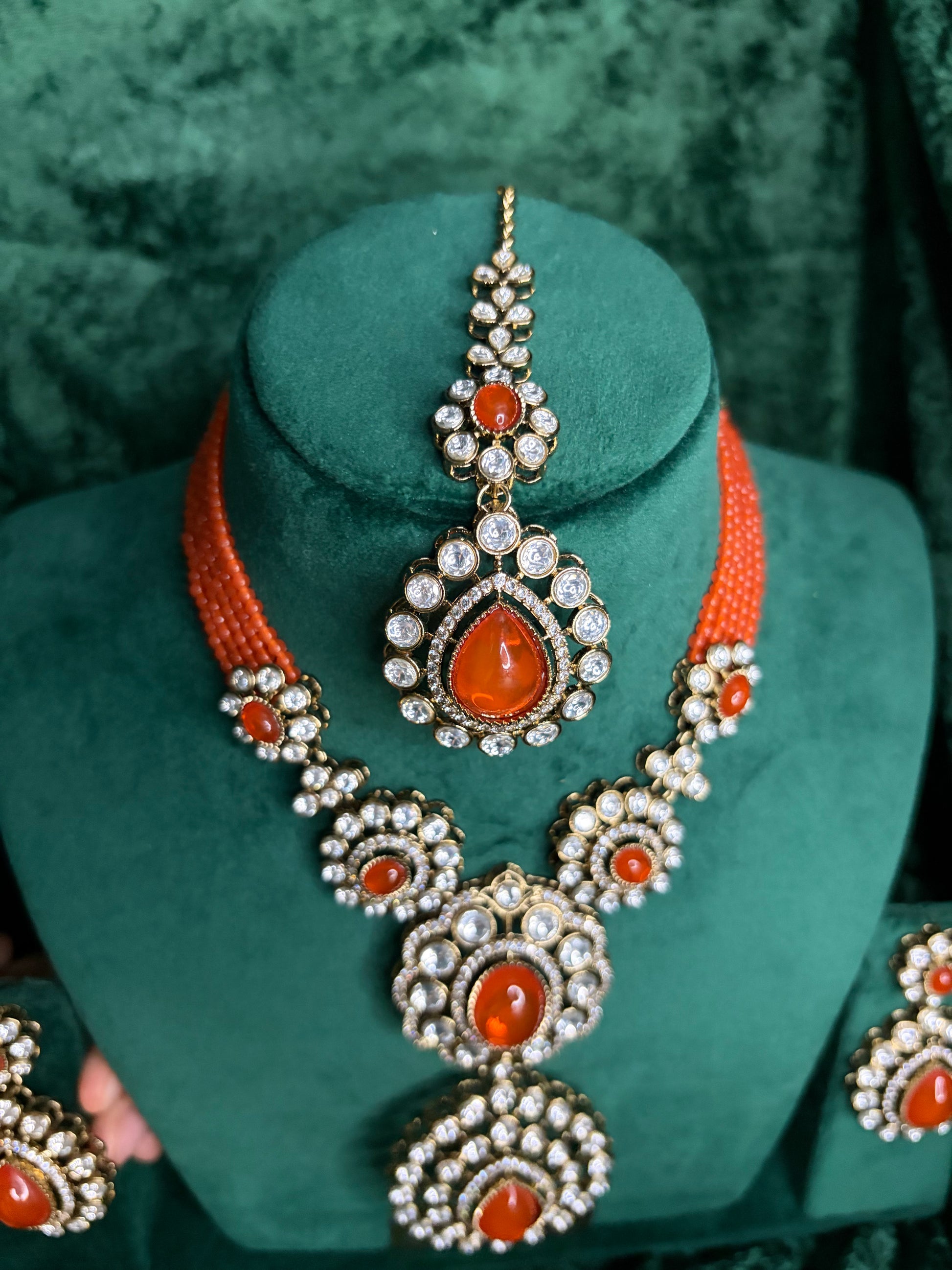 Elevate your ethnic jewelry collection with this striking orange beads pendant necklace, expertly crafted to complement traditional and contemporary styles alike. The vibrant orange beads catch light beautifully, while the coordinating tikka adds authentic cultural elegance. This curated set includes matching earrings, ensuring a cohesive, polished look from every angle. Perfect for festive occasions, weddings, or everyday wear, this versatile piece combines timeless craftsmanship with modern appeal. The warm tones flatter a variety of skin tones and pair effortlessly with both traditional attire and contemporary outfits.