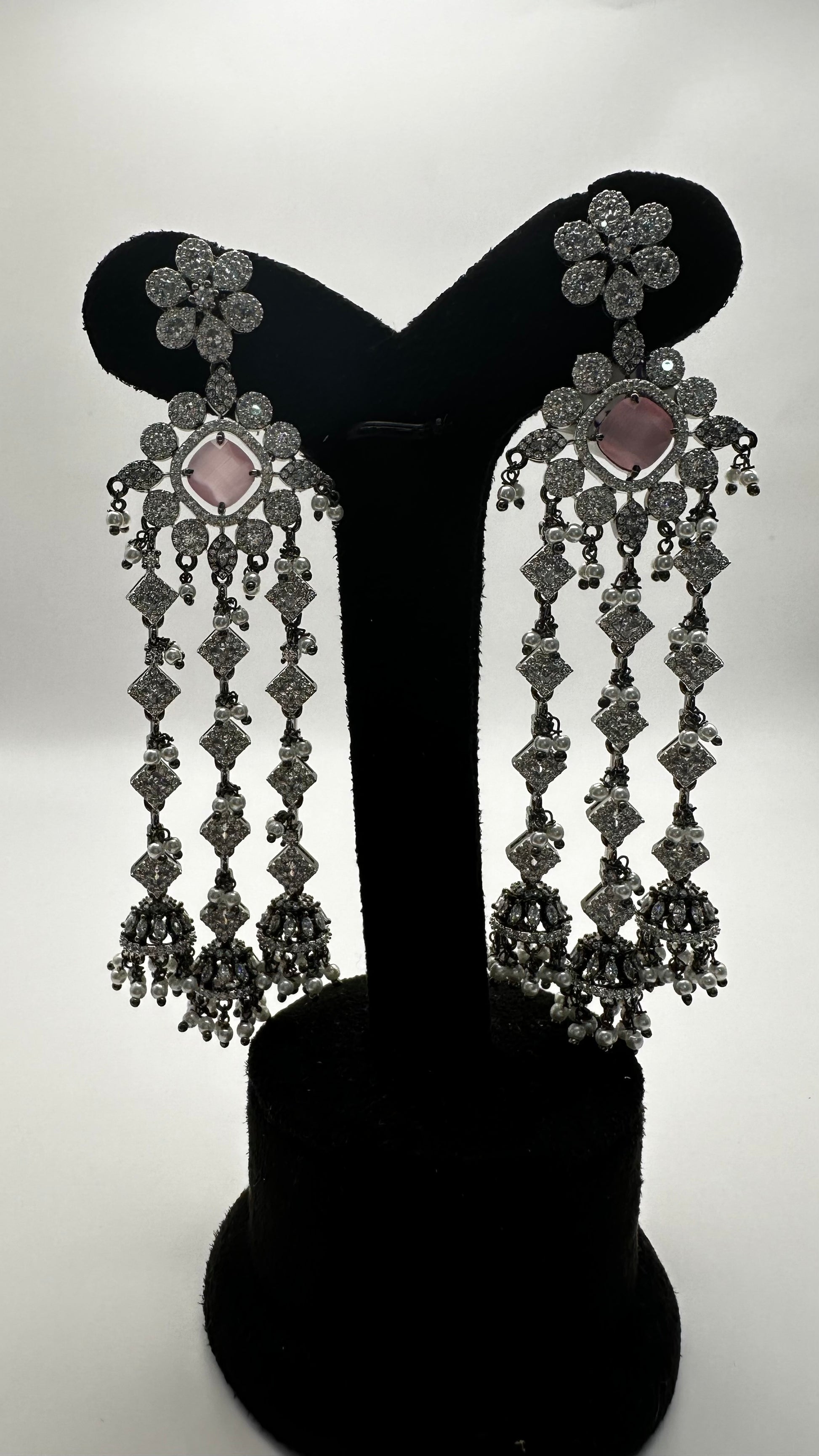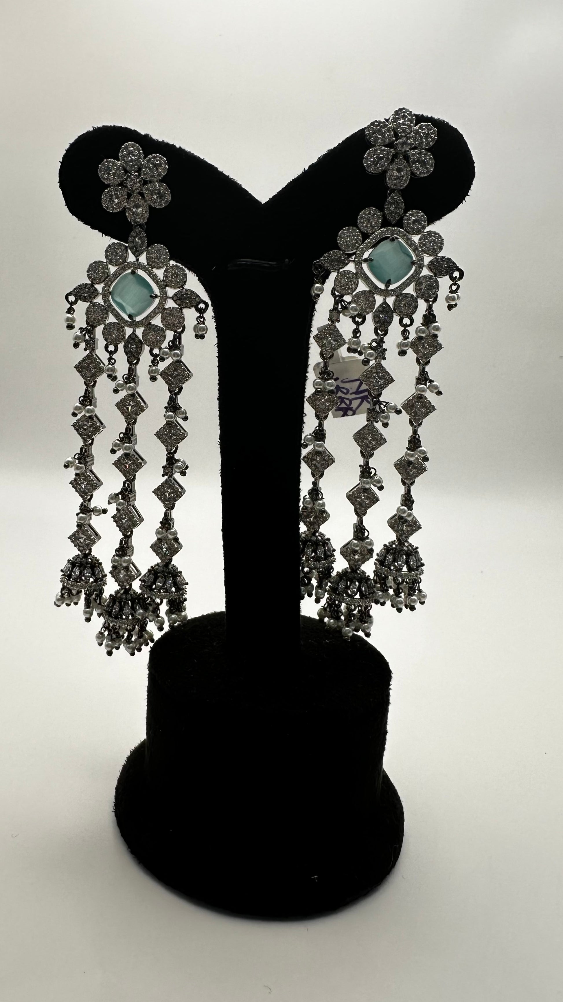 Expertly crafted chandelier jhumka earring, adorned with exquisite pearls for a stunning statement piece. Lightweight and perfect for any evening event. Elevate your look with this elegant accessory.
