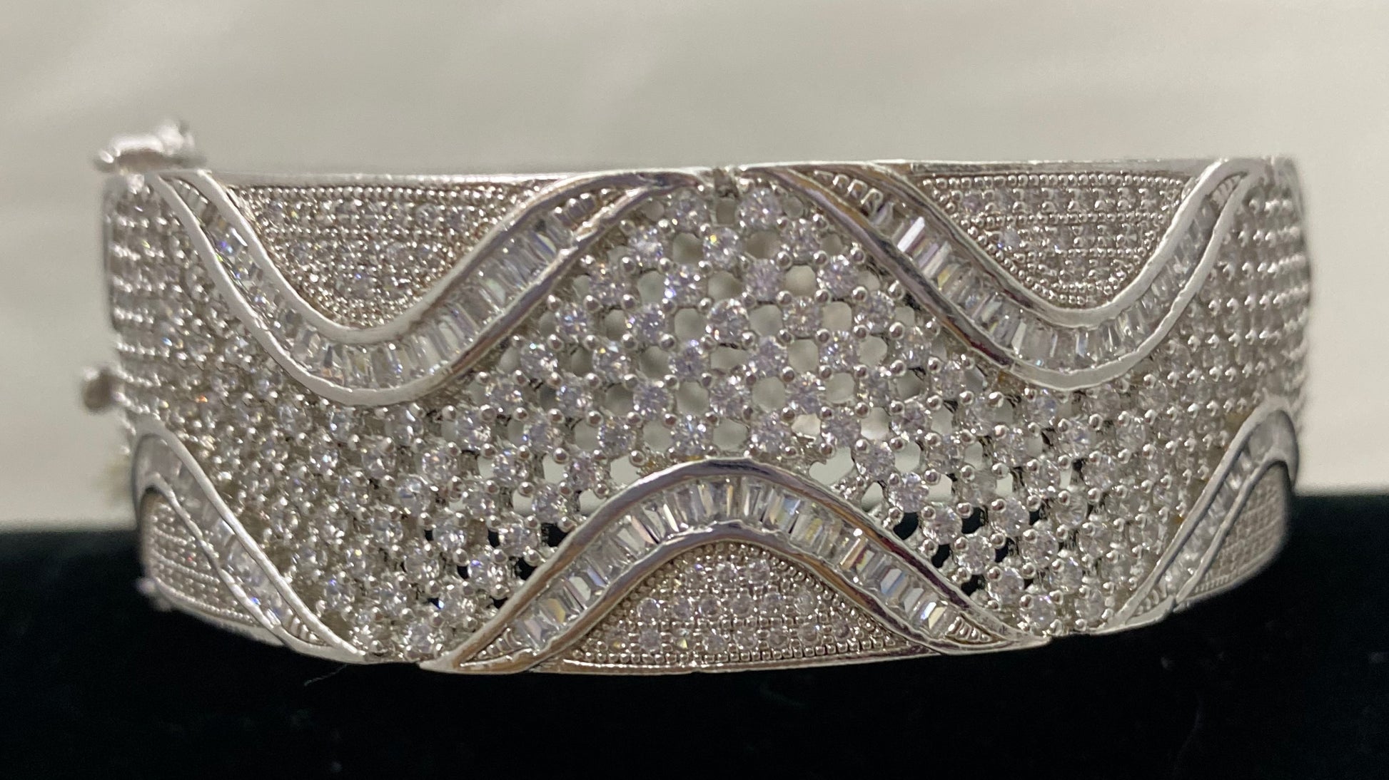 This Silver (AD) Zircon Lock Kada features a Baguette Line design with a Curve Small aesthetic, creating an elegant overall look. It has a size of 2.8, however it is flexible enough to fit a size of 2.10.